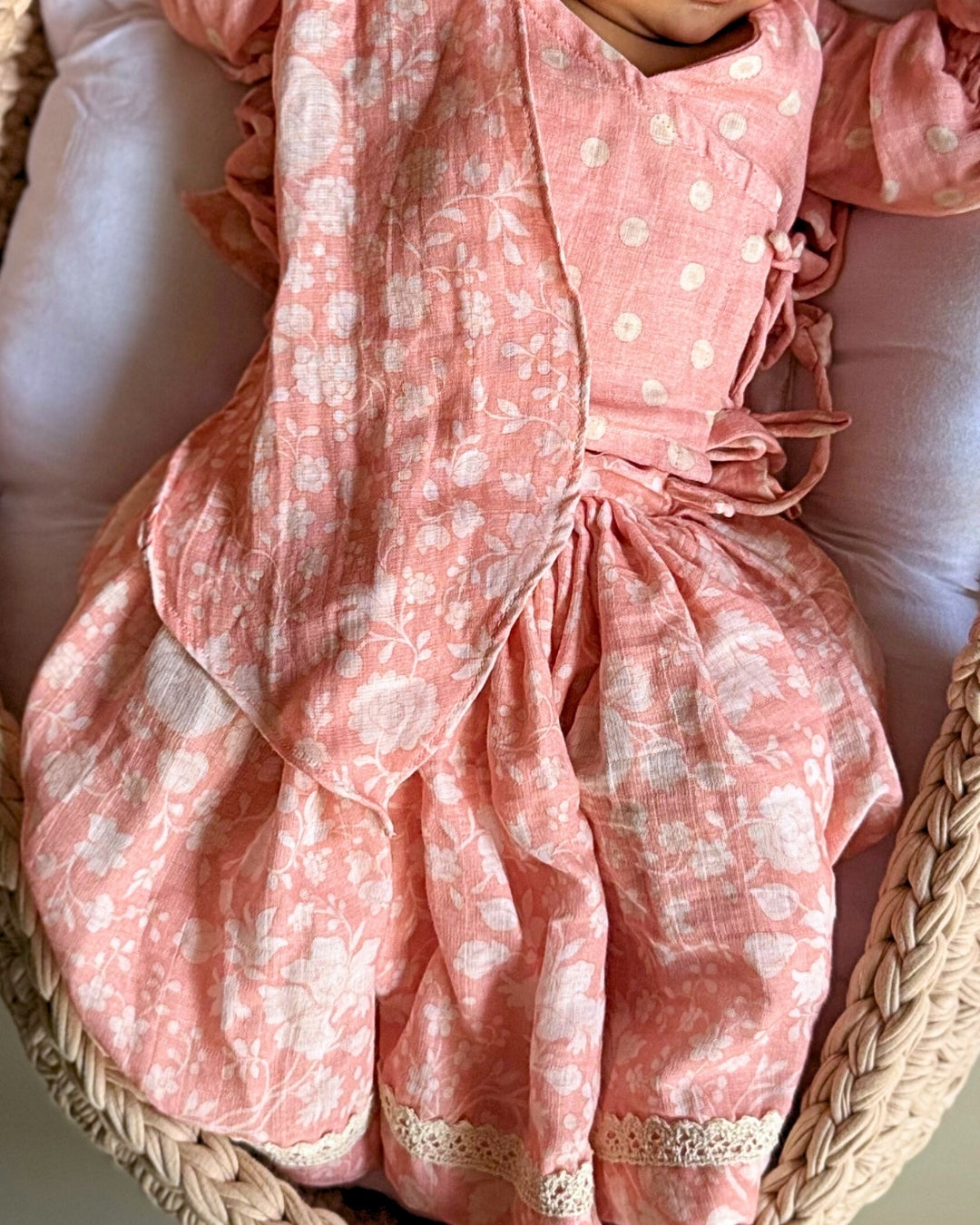 Lehenga-Pleated lehenga is fully flaired with tiny baby safe lace. Skirts have adjustable cotton strings on waist for easy wearing and fittings.