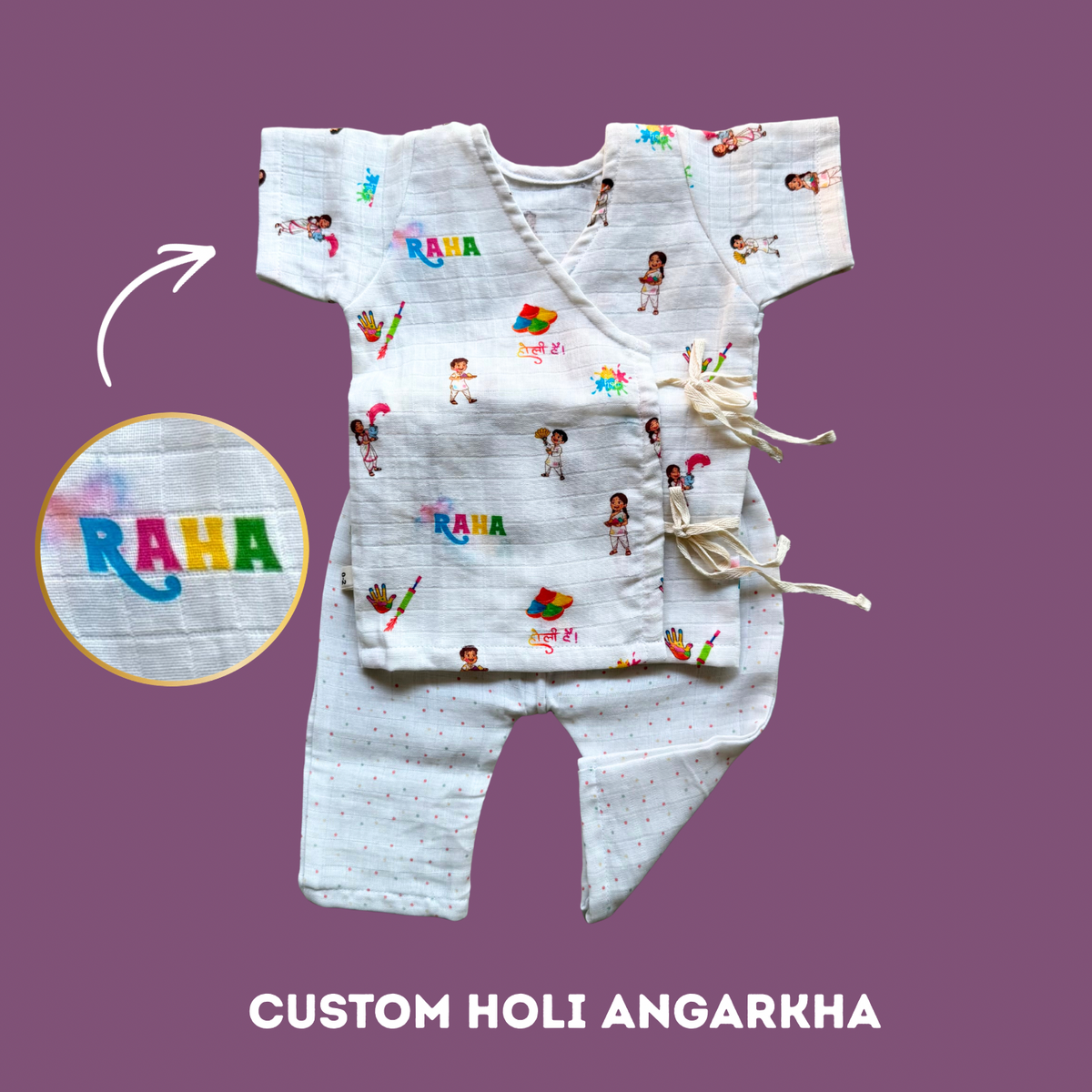 Our Holi Customised Angarkha comes as a set of top and bottom, offering both practicality and charm. Perfect for daily wear, it provides easy wash and wear convenience while keeping your baby happy and cool. It also makes an ideal gift for newborns, combining comfort with a touch of personalized style.